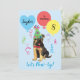 Vocês são convidados para uma pata de aniversário com um filhote de German shepherd giro, vestindo chapéu de festa, rodeado por balões e galerias coloridos. O texto pode ser facilmente personalizado. Fornecimentos correspondentes disponíveis.