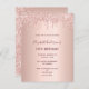 Um convite moderno, na moda e glamouroso para a festa de aniversário de uma mulher. Um fundo metálico rosa dourado falso com um brilho elegante rosa dourado, pintura gota-a-gota. O nome é escrito com um moderno e escuro, rosa dourado, escrito com letra de estilo manuscrito. Modelos para os detalhes da sua festa. Dica: Se você não quiser que pareça um cartão postal, clique em personalizar, vá para o verso e remova o divisor e o carimbo de posto.