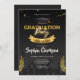 Um convite simples e clássico com um boné de formatura, confete e ouro sobre fundo preto