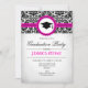 Convite festa de formatura para mulheres. Elegante design preto-rosa branco com damasco, fonte de script e um boné. Perfeito para uma festa de formatura de classe.