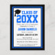 Este Cartão postal de Festa de formatura de Ano Azul e Negro é uma forma excelente de celebrar o segundo grau ou formando universitário. Personalize isso com o nome, a escola, o ano e os detalhes da festa. Este convite apresenta uma tipografia ousada em cores azuis e pretas da escola, com uma borda azul e preta.