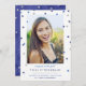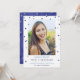 Marinho, confete azul e prateado rodeia sua foto de formando nestes anúncios de graduação de confetti simples e chique. Detalhes da festa no verso para que duplique como um convite também! (Opcional: você pode remover os detalhes do convite na parte traseira usando a ferramenta "personalizar".)