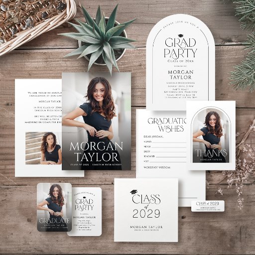 Anúncio de graduação em mini tamanho preto e branco e o Convite apresenta uma elegante fonte de serifa graciosa com fotografia, simples e sofisticada, Personalize-a com a sua própria fotografia e informações de formando no verso.