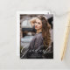 Um convite elegante e moderno para a graduação dupla com uma bela fonte de escrita caligráfica. Este design de fotos do solteiro mostrará sua foto favorita do mais velho. A parte traseira da placa contém mais quatro fotos e espaço para detalhes de uma festa de formatura ou qualquer outra mensagem que você queira adicionar.