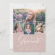 Um convite moderno para a graduação, com a palavra "formando" na frente, em caligrafia por na moda, além de 4 fotos de seu mais velho favorito. Adicione seus próprios detalhes pessoais de celebração às costas. Esta é a versão rosada empoeirada.