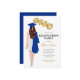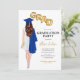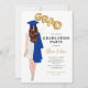 Formatação feminina Convidando mulheres a desenhar um vestido branco, boné azul e vestido, cabelos castanhos longos. As letras FORMANDO em balões faux gold foil style. Personalize com detalhes de festa de formatura, ano de aula e nome da escola. Envie-me uma mensagem para os itens correspondentes.