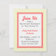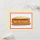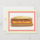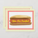 Um convite com um plano de fundo branco e um quadro em forma de retângulo vermelho com as bordas recortadas preenchidas com branco. Um retângulo de dentro de ilustração consiste em um cachorro-quente em um pão. Personalize o texto amarelo (mostarda). O lado oposto tem o mesmo plano de fundo branco e quadro vermelho que o da frente. Personalize o texto vermelho e cinza com detalhes da sua ocasião. Procure itens correspondentes na Paperie da Jill.