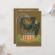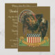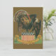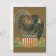 Um cartão postal de Ação de Graças com ilustração vintage apresentando um peru e uma águia careca e a bandeira americana com o texto "Dia de Ação de Graças."