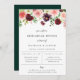 Arranjo floral em aquarela elegante em vermelho burgundy, rosa suave e verdes exuberantes, convite para jantar de ensaio. Design de tipografia chic e moderno. Verso do cartão apresenta cor verde esmeralda escuro sólido. Projetado como parte da nossa Coleção Floral Botânica Burgundy Blush.