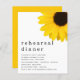 Convite para Jantar de Rehearsal do Girassol Amarelo Orçamento. Uma alternativa MENOR de 11,4 cm x 14,2 cm econômica. Disponível em PAPEL CARTÃO de 110 lb SEMI BRILHANTE ou PAPEL MAIS FINO de 80 lb com ACABAMENTO SEDA. Envelopes são um extra opcional. Estilo informal. Um girassol gigante está no canto superior direito e seus nomes estão grandes abaixo em letras minúsculas elegantes com os detalhes na parte inferior. Personalize facilmente o texto com seus próprios detalhes.