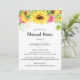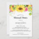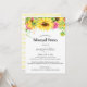 O ensaio de girassol janta o convite com flores amarelas e cor-de-rosa e folhas verdes sobre fundo branco. As flores em cascata do topo do convite. A parte de trás do convite tem um fundo listrado amarelo pálido.