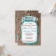 O Janto de ensaio Rustic Country Mason Jar Convoca um design de jarro de sotaque azul-lacrimogêneo sobre um fundo de grãos de madeira notoriedade.  O design de madeira nojenta também está no dorso em cor de cheio, junto com um pequeno pote de pedreiro no canto que diz "Amor".  Basta adicionar seus próprios detalhes de janto de ensaio a este modelo.