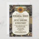 Janto de ensaio Mason Jar Camo - apresenta um fundo impresso de camo seguido de um jarro de mason que tem o topo embrulhado em fio (design impresso) com um girassol posicionado no centro. Uma banda de burlap impressa envolve a frente e o verso. A parte de trás de cada convite rústico ou de cada país apresenta o mesmo design de convite de casamento de camo que a frente compartilha. Este design pode ser atualizado para várias opções de estoque de placa encontradas acima.