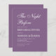 Um convite simples e minimalista para jantar o ensaio roxo. Tem apenas um texto branco sobre fundo roxo empoeirado. O título "A Noite Antes" é escrito em um roteiro caligráfico elegante. O texto fica alinhado.