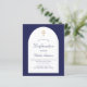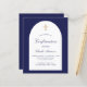 Um fundo de marinho e um quadro de arco branco. Personalize e um nome e detalhes da cerimônia. Escrito elegante com letra manual. Fundo: fundo azul marinho.