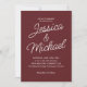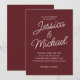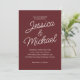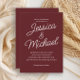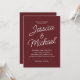 Este elegante convite de casamento burgundy apresenta um layout minimalista com sotaques românticos de guião e texto branco nítido em um rico fundo de vinho tinto. O design clássico e refinado é perfeito para o outono ou casamentos no inverno, cerimônias de vinhedo ou para assuntos noturnos formais. Facilmente personalizável com seus nomes e detalhes de casamento, este modelo eterno adiciona calor e sofisticação ao seu dia especial. Coordenando RSVP e placas detalhadas disponíveis para um conjunto coeso.