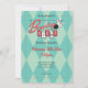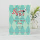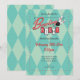 Convite para Noite de Boliche apresenta a tipografia "Noite de Boliche" em um logo estilo retrô moderno dos anos 50, com bola e pinos de boliche ilustrados. Incorpora elementos de azul, vermelho, branco e cinza, pontos e um fundo com padrão de diamantes. Inclui modelo para personalização.