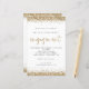 Dourado Convite para Noivado de Bordas de Glitter. Um tamanho maior de 5,5" x 8,5" a um preço orçamentário, em um STOCK CARD SEMI GLOSS de 110 lb, excelente de convites, aproximadamente na mesma espessura de um cartão postal, ou um estoque LINEN elegante de 110 lb - para um luxo, ligeiramente mais fino, com um valor de excelente. OBSERVE QUE OS ENVELOPES OPCIONAIS SÃO UM POUCO MAIORES EM TAMANHO A 6,75" x 9" aprox. Este alternativo de tamanho de orçamento também está disponível em outras opções de papel. O papel FELT de 100 lbs é colorido por buff, NÃO branco, então adiciona um toque rústico. O estoque de papel MATTE de 80 lb é branco brilhante, para impressão nítida, excelente para seus menus e programas, enquanto o papel SATIN de 80 lb é fino e leve, ideal para gabinetes. As bordas de confete de brilho falsa em ouro estão no topo e no fundo e também no verso. O noivado é definido num estilo moderno de escrita manual. Personalize facilmente o resto do texto para você.