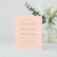 Um simples convite para festas de noivado com uma cor moderna: rosa-claro. Ele tem apenas texto de ouro sobre fundo de blush. Os nomes são escritos num script caligráfico elegante, o resto em bonés. a primeira linha é texto arquivado.