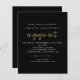 Simples Script Dourado Noivado Preto Convidado. Um alternativo de 4,5 pol x 5,6 pol com preço inferior. Disponível em um STOCK DE CARTÃO SEMI GLOSS 110 lb, que é a opção padrão (recomendada para convites), OU um STOCK DE PAPEL THINNER SATIN FINISH 80 lb (ideal para gabinetes). Os envelopes são um extra opcional e são ligeiramente maiores que o tamanho da placa. Minimalismo moderno em preto clássico com tipografia branca e dourada. O noivado é definido num estilo moderno de escrita manual. Personalize facilmente o resto do texto para você.
