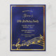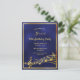 Na frente: Um cartão de convite de festas moderno e moderno para homens. Um fundo azul escuro, azul marinho. A cor azul é irregular. Com uma falsa imagem de ouro e notas musicais, letras coloridas de ouro. Modelos para informações sobre a sua parte. Fundo branco. Dica: Se você não quiser que pareça um cartão postal, clique em personalizar, vá para o verso e remova o divisor e o carimbo de posto.
