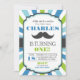 Um convite moderno, na moda, clássico, azul para o Mustache Bash. Perfeito para pôr o palco para a festa de aniversário de qualquer homem! Para obter mais designs de Sarah Maiga, visite www.maigadesigns.com