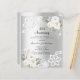 Para um elegante e romântico aniversário de 25. Um fundo com aspecto fino prateado decorado com flores, rosas e rendas brancas. Personalize e adicione seus nomes e detalhes. 1 folha = 1 convite impresso de borda a borda.