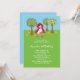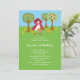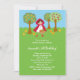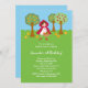 Convite bonito e colorido baseado no livro de histórias do Chapéu Vermelho. Apresenta um feliz Chapeuzinho Vermelho na floresta com árvores e flores e um céu azul. Excelente para o aniversário de uma menina. Trendy e um convite para pegar os olhos.