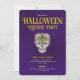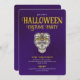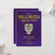 O convite do Skull Halloween Party, estilo gótico, com um fundo roxo e resfriado. Pronto para personalizar com seus detalhes.