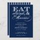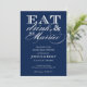 Este convite para jantar de ensaio sofisticado apresenta a frase "Coma, beba e case-se" em tipografia em negrito.