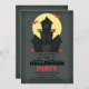 Eerie Haunted House Convite de festas apresentando uma casa assombrada com morcegos vermelhos e jack o'lanternas contra uma lua amarela clara.