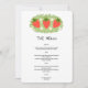 Cute Red Strawberry Leafy Menu Este morango vermelho, leafe, cardápio de casamento fofo é excelente para um casamento de verão! O único boho design apresenta morangos picnic bonitos em folhagem vermelha, de folha verde, e dentes-de-leão bonitos. Personalize o menu com as suas próprias opções de menu.