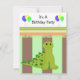 Um dinossauro verde giro com manchas verdes mais escuras e uma cauda espichave. Um fundo listrado de verde e marrom com acentos de faixa laranja e verde. Balões nos cantos superiores em azul, amarelo e verde.