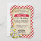 Cheque de gingham vermelho de piquenique com design de cartão de convite de aniversário de margaridas.
