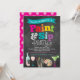 Nosso convite de estilo quadro-negro para Festa de Pintura Paint and Sip, brilhante e colorido, é o convite perfeito para qualquer evento de pintura e vinho. Nosso design apresenta um fundo de quadro-negro, uma mistura de letras de padrões divertidos, como bolinhas, listras e chevron, e ilustrações e gráficos de arte, como uma paleta de artista, garrafa de vinho, taça de vinho e margarita!