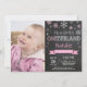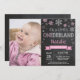 Convite para primeiro aniversario da Winter Onederland Girl com foto personalizada. Floco de neve rosa e branco. Primeiro Aniversário. Garota 1rua no Bairro Convidam. Fundo Chalkboard. Preto & Branco. Para mais personalização, clique no botão "Personalizar" e use nossa ferramenta de design para modificar este modelo.