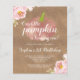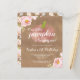 O primeiro convite de aniversário desta rústica menina apresenta uma abóbora de folha de papel azul rosa-dourada com as palavras "Nossa abóbora está virando uma" em escrita branca decorativa. Bonito colônia rosa floresce decorando dois cantos. Personalize-o com o seu nome e número de aniversário em um roteiro branco correspondente e os detalhes em fontes brancas sans serif em um fundo castanho Kraft-look. O reverso apresenta um padrão de peônias cor-de-rosa correspondente em um fundo Kraft castanho. Ideal para uma festa de aniversário de outono!