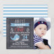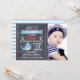 O convite de festas náutico de primeiro aniversario do quadro-negro deste rapaz apresenta uma baleia fofa, duas âncoras e uma faixa em fundo de quadro-negro digitalizado. Também incluí algumas fontes desenhadas à mão. A fotografia do seu filho aparece no lado direito do convite. O verso do convite é um padrão listrado azul claro e branco. Eu queria criar alguns novos convites de aniversário náutico para a loja porque tem sido um tema de aniversário muito popular na loja. Este convite para primeiros aniversarios é particularmente adequado para um primeiro aniversario de tema náutico ou baleia. O convite está pronto para você personalizar.