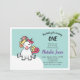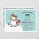 Primeiro cartão de convite de aniversário em azul pastel, com um bebê unicórnio gordinho. Do outro lado, um padrão de unicórnio com estrelas, arco-íris, doces, luas e arcos.