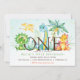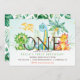 O convite para primeiros aniversarios temático do dinossauro apresenta três dinossauros. Voltar a convidar tem um padrão verde tropical.