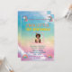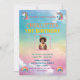 Este é um convite de aniversário de um unicórnio de cor pastel para o primeiro aniversário de uma criança. Ele apresenta um fundo balbucioso com matizes suaves do arco-íris, ilustrações unicórnios e uma foto central da criança de aniversário. O texto inclui detalhes do evento, como data, hora, local e informações de RSVP. Perfeito para uma celebração mágica e divertida. Personalize para um toque pessoal!