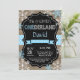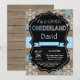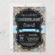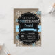 Convite para primeiro aniversario do Winter Onederland Boy. Floco de neve azul e branco. Primeiro aniversário. Convidado para rua. Fundo do Quadro de Madeira Rústica. Preto & Branco. Rapaz Ribbon. Para mais personalização, clique no botão "Personalizar" e use nossa ferramenta de design para modificar este modelo.