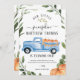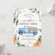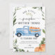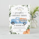 Verde maravilhoso com bombeiros que trazem um caminhão azul cheio de abóboras.