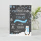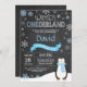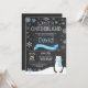 Convite ao primeiro aniversario de Winter Onederland. Pinguim. Floco de neve azul e branco. Primeiro Aniversário. Convidado para rua. Fundo Chalkboard. Preto e Branco. Para mais personalização, clique no botão "Personalizar" e use nossa ferramenta de design para modificar este modelo.