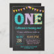 Convite para primeiros aniversarios. Primeira festa de aniversário de aniversário. Rosa, Roxo, Laranja, Amarelo, Verde, Azul, Teal, Aqua. Listras. Fundo Chalkboard. Para mais personalização, clique no botão "Personalizar" e use nossa ferramenta de design para modificar este modelo.