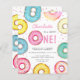 Você está planejando uma primeira festa de aniversário para a sua doce? Este belo convite de aniversário de orçamento é decorado com rosquinhas de aquarela em tons pastéis. Facilmente personalizável. Original Watercolor © Michele Davies.