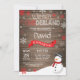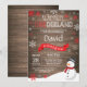 Rustic Winter Onederland primeiro aniversario Invitation. Homem de neve. Floco de neve vermelho e branco. Primeiro Aniversário. Convidado para rua. Fundo Rustic Wood. Preto & Branco. Para mais personalização, clique no botão "Personalizar" e use nossa ferramenta de design para modificar este modelo.