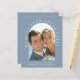 Anúncio de elopemento azul empoeirado e convite de recepção. A frente mostra sua foto de casamento em um quadro de arco e "Feliz Festa Depois" em uma elegante tipografia branca. Sob sua foto, adicione seus nomes, data do casamento e local. No verso, personalize seu anúncio e convite, adicione seus nomes em um script semelhante a assinatura e insira seu endereço de site de casamento para criar um código de QR digitalizável para seus convidados digitalizarem para RSVP on-line e obter detalhes adicionais.