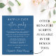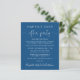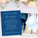 Um elopeio de orçamento ou um anúncio de casamento menor para informar a família e os amigos que seus planos de casamento mudaram, e você fugiu ou reduziu o número de convidados no seu casamento, e convidá-los para uma recepção de casamento ou festa de celebração. A frente apresenta "Felizmente Nunca Depois da Festa" em uma mistura de simples tipografia branca e um roteiro elegante com traços contra um fundo azul clássico, e você pode personalizar sua mensagem e convite com mais detalhes e seus nomes em um roteiro semelhante a assinatura. O verso mostra sua foto favorita do casamento, seus nomes e data do casamento.