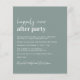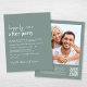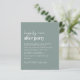 Convidado de recepção de casamento verde sensual, amigável em orçamento, com "Feliz Nunca Depois da Festa" em uma mistura de um roteiro branco contemporâneo e um mínimo ousado de letras brancas, e seus nomes em um roteiro semelhante a assinatura. No verso, carregue sua foto e insira seu endereço no site do casamento para criar um código QR para seus convidados digitalizarem para RSVP on-line e obter detalhes adicionais do casamento. Este papel semirbrilhante do orçamento é semelhante em peso ao papel fotográfico. Também está disponível uma versão maior do estoque de cartão tradicional 5x7 (mensagem para o link).